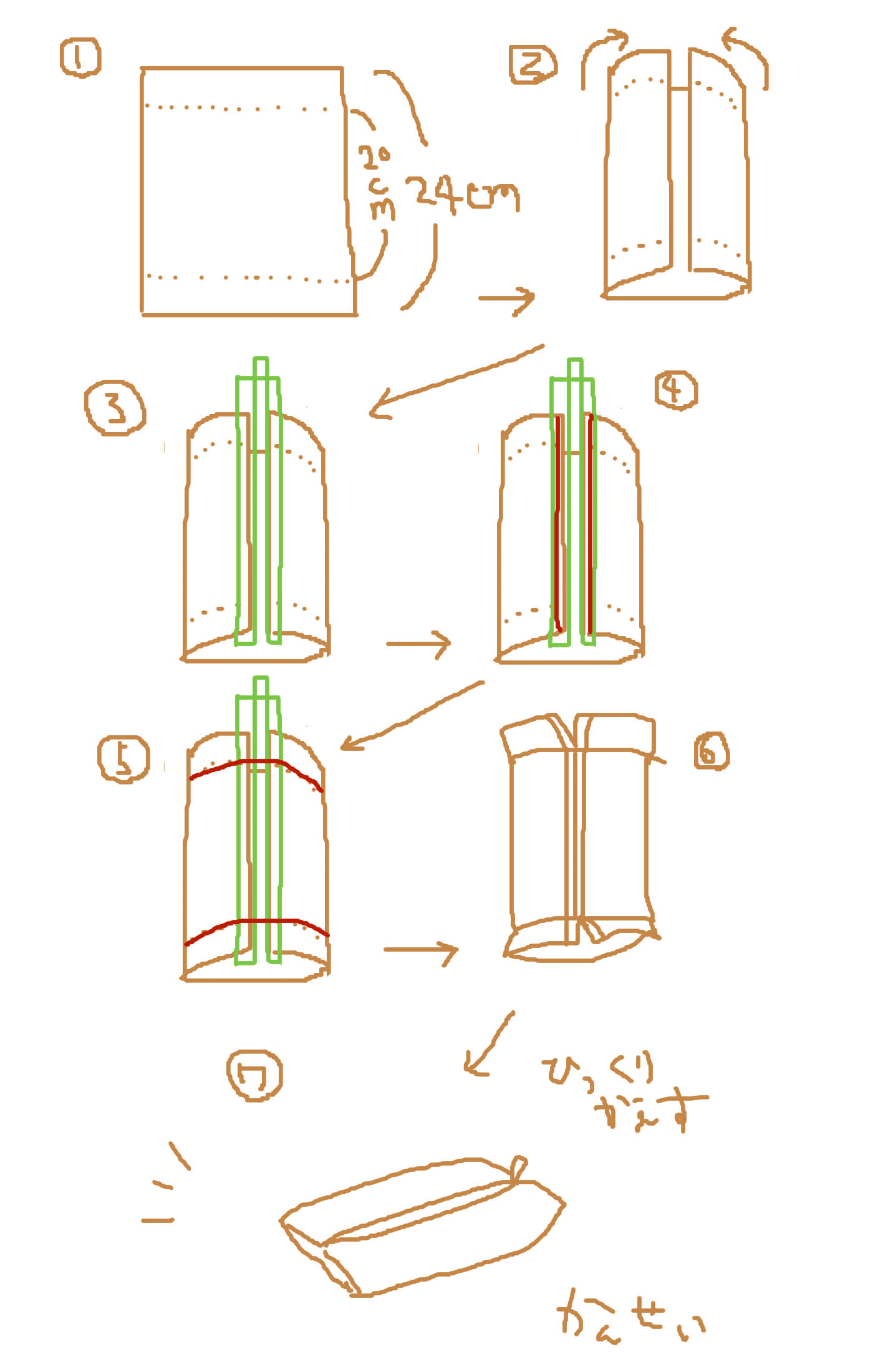 ④では赤線を引いた部分をミシンなどで縫いつけます。だだーっと。